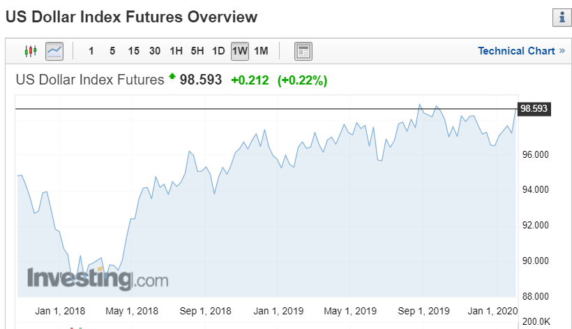 달러 인덱스는 2018년 5월부터 꾸준히 상승중이다. 아마도 달러 인덱스에서 비중이 큰 유로화가 맥을 못추기 때문에 강달러는 한동안 유지되지 않을까 생각한다. 그리고 신종 코로나 바이러스로인해 안전자산인 달러의 수요가 증가하여 반등하는 모습을 보여줬다.