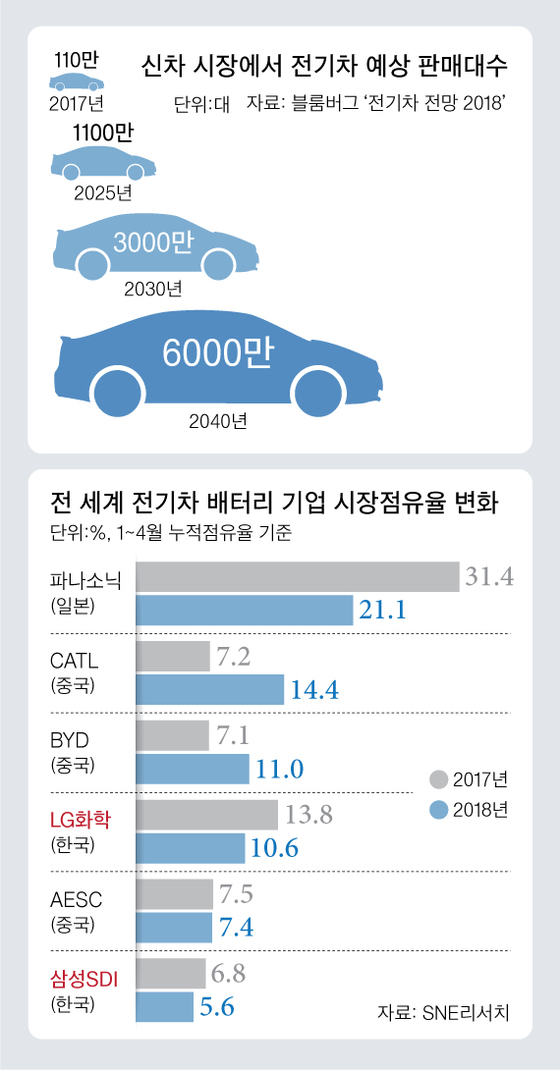 세계 배터리시장의 점유율은 일본의 파나소닉, 중국의 CATL, BYD, 우리나라의 LG화학이 시장점유율을 주로 구성하고 있다. 2017년과 2018년에 눈에 띄는 변화는 파나소닉이 10%가량 점유율을 잃은 것이다. 2차전지의 기술력이 기대되는 CATL과 BYD가 점유율을 뺏어온 것이다. LG화학도 약 3%가량 점유율이 감소했다.