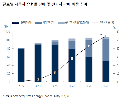 위의 표를 보면 2020년 전체 완성차 생산량인 90억 대 중 전기차의 비중은 3%정도로 매우 낮은 수치이다. 하지만 5년 뒤 완성차 생산량이 100만대로 성장하면 전기차의 비중은 3배가 늘어난 11%로 늘어난다. 이러한 성장성을 2040년도에 예상하면 전체 완성차 생산량에 55%까지 차지하게 된다.