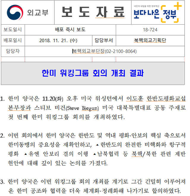 한미 워킹그룹회의란 북미 비핵화 협상과 관련해 대북 공조 방안을 조율하는 실무협의체로서 우리측에서 이도훈 외교부 한반도평화교섭본부장과 미국측에서 스티븐 비건 국무부 대북특별대표가 총괄하고 있다.