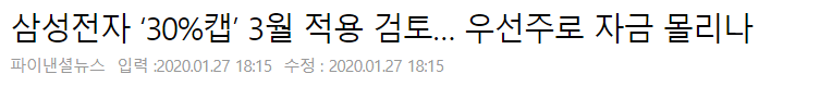 최근 삼성전자우를 검색했을 때의 기사타이틀이다. 대체로 작년 4분기부터 떠오르던 삼성전자 시총상한제와 관련된 기사가 많다. 시총상한제란 코스피200지수에서 삼성전자의 비중을 30%로 제한하는 것이다.