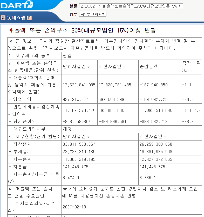 롯데쇼핑은 공시에서 국내외 소비경기 둔화로 인한 영업이익 감소라고 공시했다. 사드보복으로 중국에서 철수를 결정한 롯데마트와 온라인 이커머스의 점유율 확대 앞에서 영업이익이 급감한 것이다.