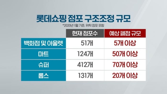 롯데쇼핑은 롯데백화점, 롯데마트, 롯데슈퍼, 롭스 등 오프라인 매장을 축소하기로 발표했다. 오프라인 점포가 모두 700개정도 되는데, 이중에서 영업성과가 저조한 점포 200여개를 축소하기로 결정한 것이다. 전체 매장에서 30% 가량을 정리하는 결정으로 3~5년에 걸쳐서 순차적으로 폐쇄될 것이다.